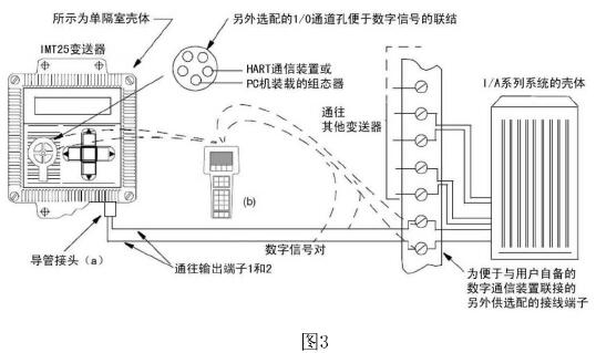 HART通信裝置或裝載在PC機上的組態器可以連接在變送器現場接線端到外部負載之間的任何位置,或連接到另外配供的1/0孔口上。如圖3所示: