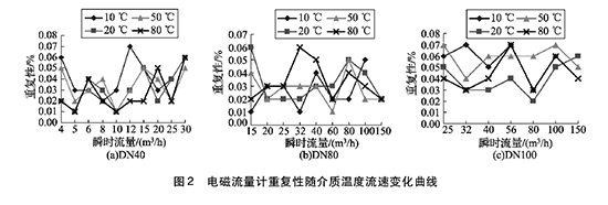 將實驗測得的電磁流量計dn350在不同溫度及流速下的重復性數據整理,特性曲線如圖2所示,3組曲線分別對應DN40, DN80, DN100的3塊電磁流量計dn350的重復性曲線。