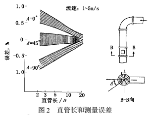 2000年上海原水公司擬在已建成的某泵站加裝DN2200稀硝酸流量計,但彎管下游安裝位置的前直管長度明顯不符合規定中5D~10D(D為管徑,下同)的要求,此時,影響測量誤差有多大呢?