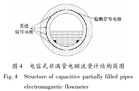 ②電容式非滿管污水廠出水用電磁流量計h。電容式非滿管污水廠出水用電磁流量計結構簡圖如圖4所示。、檢測信號電極 發送信號電