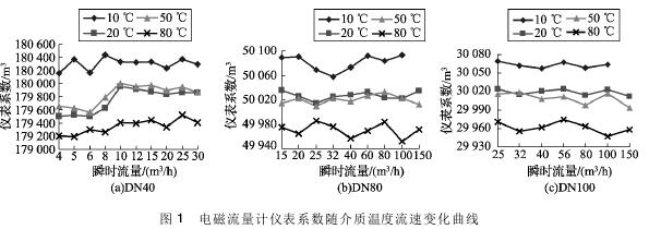 將實驗測得的環保污水專用流量計在不同溫度及流速下的儀表系數數據整理,特性曲線如圖1所示,3組曲線分別對應DN40、DN80、DN100的3塊環保污水專用流量計的儀表系數曲線。