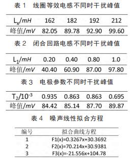 仿真試驗(yàn)中,設(shè)定線圈等效電感取值范圍為 162~212mH,間隔 10mH;閉合回路等效電感范圍 0.2~1mH,間隔為 0.2mH;雙電層電容、接觸電阻隨流體電導(dǎo)率變化而變化,電導(dǎo)率增大接觸電阻和雙電層電容減小而電荷傳遞電阻增大。可設(shè)定電極接觸電阻、雙電層電容和電荷傳遞電阻范圍分別為 5~15kΩ、10~20μF 和50~60Ω,由公式(7)知,可用 T2 表示上述三者關(guān)系。 仿真參數(shù)取值不同情況下,通過 MATLAB 工具箱對(duì)仿真測(cè)量得到的干擾峰值進(jìn)行曲線擬合畫出相應(yīng)的曲線圖。 其中仿真數(shù)據(jù)和相對(duì)應(yīng)的曲線方程如表 1~表 4 所示,曲線圖如圖 4~圖 6。