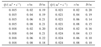 表3中,當來流流量較小時(Q=0.015m3/s),回流區的長度D隨著浮體結構位置的增大逐漸增大;當來流流量較大時(Q=0.024m3/s),回流區的長度卻隨著浮體結構位置的增大呈現減小的趨勢。試驗過程中,當浮體結構位置較高且來流較小時,浮體結構上下部區域的主流流速較小,回流區范圍較大;浮體結構位置不變時,來流流量增大,回流區長度減小。來流增加,下泄水流流速較大,并迅速將回流區內的水流帶入下游區域,因此回流區長度反而呈現減小趨勢。