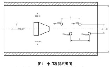 插入式煙氣流量計(jì)實(shí)現(xiàn)流量測量的理論基礎(chǔ)是流體力學(xué)中**的“卡門渦街”原理,在流動的流體中裝置一個非線性三角柱形體,即渦旋發(fā)生體,如圖 1 所示。當(dāng)流體沿渦旋發(fā)生體繞流時(shí),會在渦旋發(fā)生體下游產(chǎn)生兩列不對稱,但有規(guī)律交替地分離釋放出一系列漩渦束,只有當(dāng)兩渦漩列之間的距離 h 和同列的兩渦漩之間的距離 L 之比滿足 h/L=0.281 時(shí),所產(chǎn)生的渦街才是穩(wěn)定的。