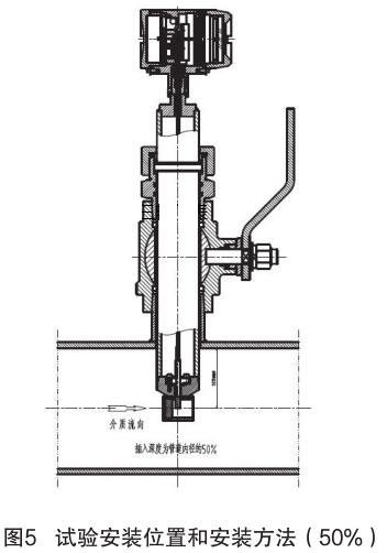 對插入式煙氣流量計(jì)和插入式電磁流量計(jì)的結(jié)構(gòu)原理進(jìn)行分析,插入式電磁流量計(jì)的信號采集點(diǎn)在標(biāo)校管道內(nèi)12.5% 為宜,因它屬電磁類流量計(jì),而煙氣流量計(jì)是根據(jù)“卡門渦街”原理進(jìn)行測量管道內(nèi)流量,根據(jù)標(biāo)校管道內(nèi)層流和湍流的分析,以及插入式煙氣流量計(jì)獨(dú)特的探頭結(jié)構(gòu)形式,確定插入式煙氣流量計(jì)的插入深度為標(biāo)校管道內(nèi) 50%,試驗(yàn)安裝位置和安裝方法如圖 5 所示。