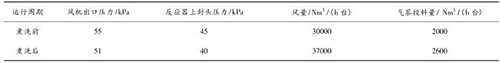 煤氣流量計煮洗吹掃后,裝置運行期間無燃爆事故,且裝置運行的風量明顯提高,系統阻力明顯降低,投料量增加。現將煮洗前后的運行數據對比如下: