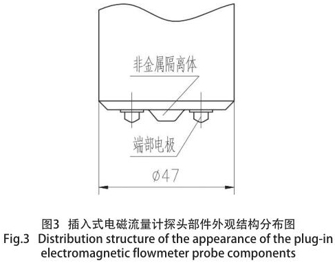 通過大量的試驗(yàn),對(duì)探頭端部外型結(jié)構(gòu)亦采用特殊設(shè)計(jì),從而消除兩個(gè)電極之間的擾流現(xiàn)象,同時(shí)亦消除因通電產(chǎn)生磁場(chǎng),導(dǎo)致兩個(gè)電極吸附介質(zhì)中的鐵屑而影響測(cè)量精度和死區(qū)效應(yīng),增強(qiáng)了輸出信號(hào)的穩(wěn)定性,從而提高傳感器準(zhǔn)確度和抗干擾性。通過結(jié)構(gòu)的優(yōu)化設(shè)計(jì),使用壽命更長(zhǎng),電磁流量計(jì)探頭局部,如圖 3 所示。