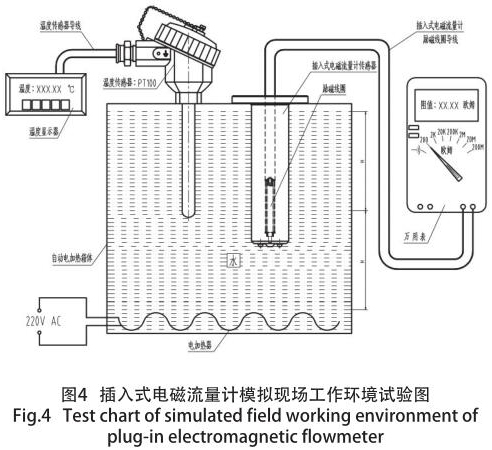 其原因是:勵(lì)磁線圈的阻值及匝數(shù)是按照常溫狀態(tài)下進(jìn)行設(shè)計(jì)的,而含有勵(lì)磁線圈的電磁流量計(jì)經(jīng)常是高于常溫狀態(tài)下進(jìn)行安裝、使用(如:高爐回水、供熱管道等),勵(lì)磁線圈的阻值隨使用環(huán)境溫度的變化而變化,致使電磁流量計(jì)測(cè)量時(shí)的準(zhǔn)確度大為降低,性能的不確定性大為增加,為了保證儀表的高準(zhǔn)確度和穩(wěn)定性,在不同的季節(jié)(主要是環(huán)境溫度和介質(zhì)溫度),經(jīng)過大量模擬現(xiàn)場(chǎng)實(shí)際情況的試驗(yàn),并結(jié)合轉(zhuǎn)換器的技術(shù)參數(shù)要求,得出一個(gè)完善的勵(lì)磁線圈各種技術(shù)參數(shù)。模擬現(xiàn)場(chǎng)試驗(yàn)裝置如圖 4 所示。