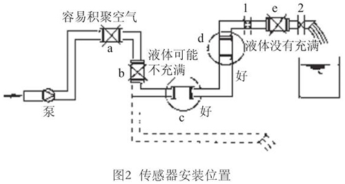 液體流動方向必須與傳感器殼體上箭頭方向一致。對于能正反向測量的液氮流量計(jì),若方向不一致雖仍可測量,但設(shè)定的顯示流動正反方向不符,必須改正之。若拆傳感器工作量大,也可改變傳感器上箭頭方向和重新設(shè)定顯示儀表符號。管道未充滿液體主要是管網(wǎng)工程設(shè)計(jì)或傳感器安裝位置不妥,使傳感器測量管內(nèi)不能充滿液體。應(yīng)采取措施,避免安裝如圖2所示a,e位置和以虛線管排放時b位置,改裝到c,d位置。