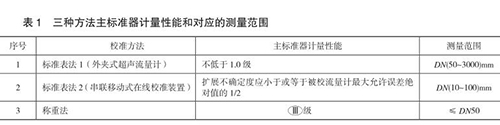 三種方法標準器的測量范圍應覆蓋被校流量計的測量范圍。標準表法 1 中,超聲波流量計在實驗室不同管道口徑和不同管道材質標定的系數各不相同,為提高在線校準準確度,應將超聲流量計的換能器探頭在實驗室用不同管徑、不同材質的管道進行流量修正系數的標定,標準表現場使用時的條件與實驗室溯源的條件應保持一致或接近。