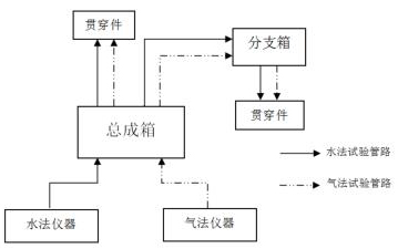 安全殼遠(yuǎn)傳渦街流量計(jì)以總成箱和分支箱為核心。試驗(yàn)初期,將總成箱置于儀器放置區(qū),分支箱置于貫穿件集中區(qū)域附近,檢漏儀至總成箱再至分支箱之間的管線固定連接,如圖2所示。水法試驗(yàn)管路與氣法試驗(yàn)管路互相獨(dú)立,總成箱和分支箱的每一路連接采用編號(hào)標(biāo)記進(jìn)行區(qū)分,并設(shè)置控制閥控制開關(guān)和流向。