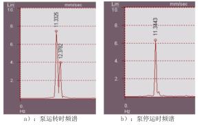 對振動采集器獲取的信號進行譜分析,超聲波污水流量計組運轉狀態下主要振動頻率為11.33Hz和12.38Hz,其中12.38Hz為液體流量計轉動頻率;停運時,12.38Hz的液體流量計轉頻消失,11.33Hz的外部激擾力依然存在。
