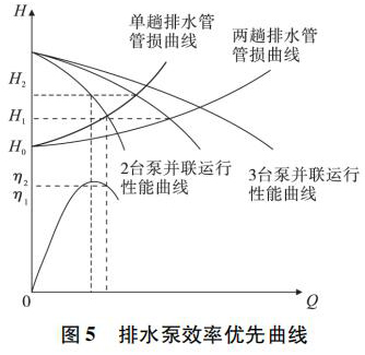 當(dāng)執(zhí)行多臺(tái)排水泵同時(shí)運(yùn)行時(shí),通過(guò)排水泵特性曲線與管路特性曲線的比較,選擇非常好的匹配排水泵與排水管數(shù)量,保證排水泵在非常好的新效率點(diǎn)運(yùn)行。如圖 5 所示。