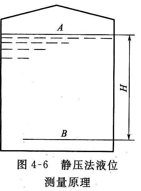 由式(4—8)和式(4—9)可知,液體任何一點(diǎn)的壓力等于其表面壓力加上液體密度與重力加速度及液柱高度的乘積。液體的靜壓力是液位高度和液體密度的函數(shù),當(dāng)液體的密度為常數(shù)時,A、B圖4—6靜壓法液位測量原理兩點(diǎn)的壓力或壓差僅與液位高度有關(guān)。因此可以通過測量P或Ap來實現(xiàn)液位高度的測量。這樣液位高度的測量就變?yōu)橐后w的靜壓測量,凡是能夠測量壓力或壓差的儀表,只要量程合適均可用于液位測量。