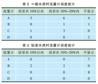 表1中,“—”表示超聲波流量計因接收信號差而不顯示累計流量,誤差>20%的超聲波流量計累計流量表示因接收信號質量差導致的儀器測量錯誤。對表1中的數據進行分類處理,以便得到一般和較差水質2種情況時4臺流量計的誤差統計。表2和表3分別為為一般和較差水質時的流量計誤差統計。